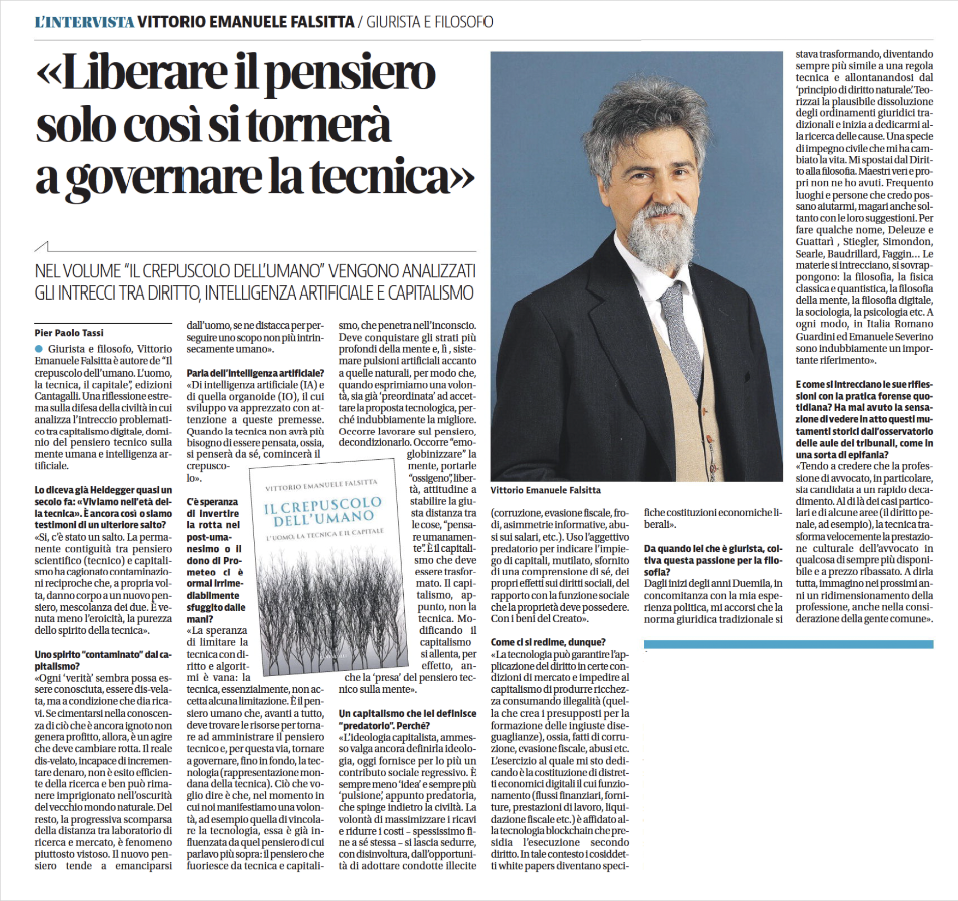 Nell’intervista su Libertà a cura di Pier Paolo Tassi, Vittorio Emanuele Falsitta propone una lettura incisiva del rapporto contemporaneo tra tecnica e capitalismo e, al tempo stesso, auspica lo sviluppo di soluzioni e strumenti innovativi che, nell’incontro tra diritto e nuove tecnologie, consentano di orientare in senso più autenticamente umano il prossimo futuro.